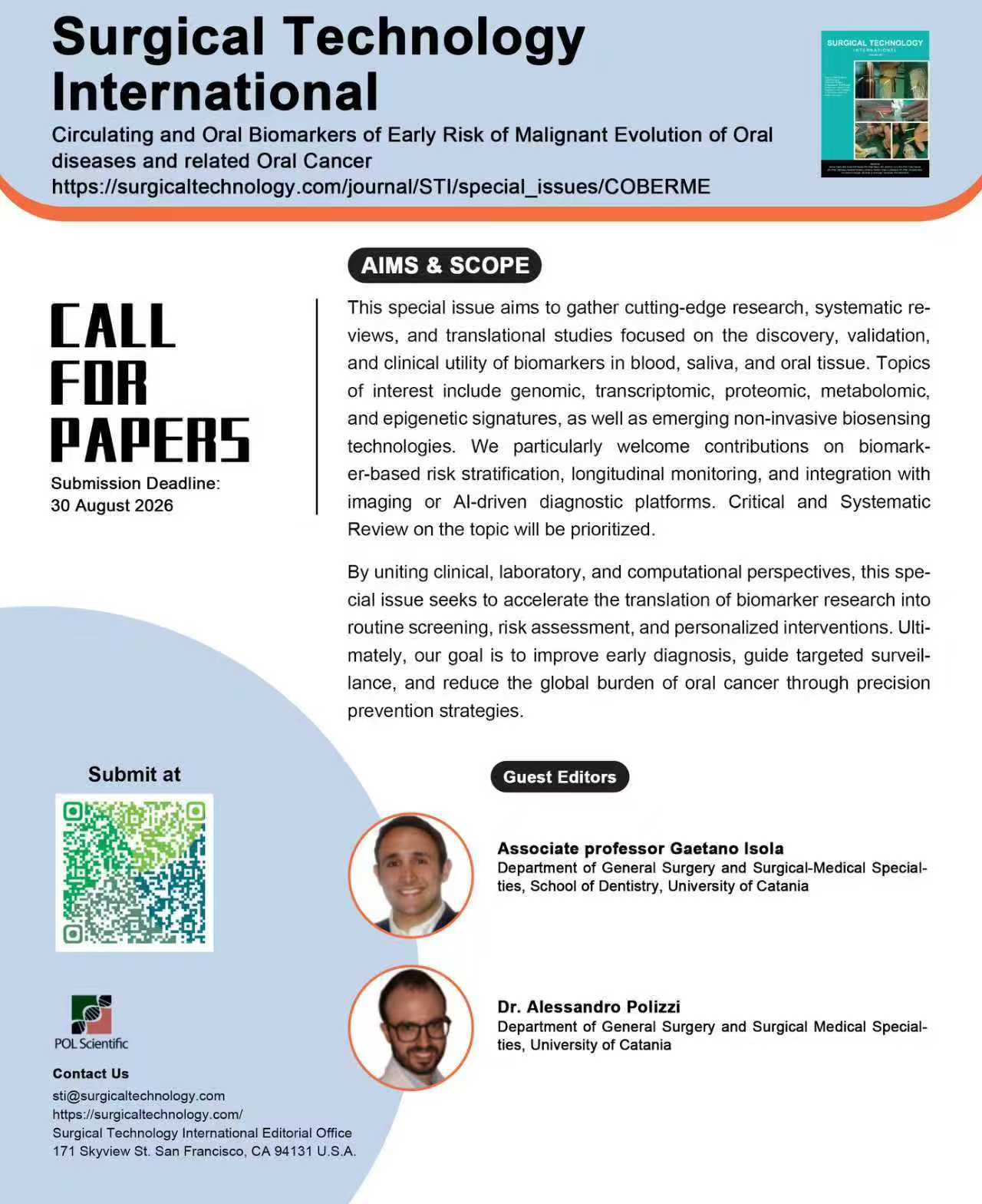 This special issue aims to gather cutting-edge research, systematic reviews, and translational studies focused on the discovery, validation, and clinical utility of biomarkers in blood, saliva, and oral tissue. Topics of interest include genomic, transcriptomic, proteomic, metabolomic, and epigenetic signatures, as well as emerging non-invasive biosensing technologies. We particularly welcome contributions on biomarker-based risk stratification, longitudinal monitoring, and integration with imaging or AI-driven diagnostic platforms. Critical and Systematic Review on the topic will be prioritized.