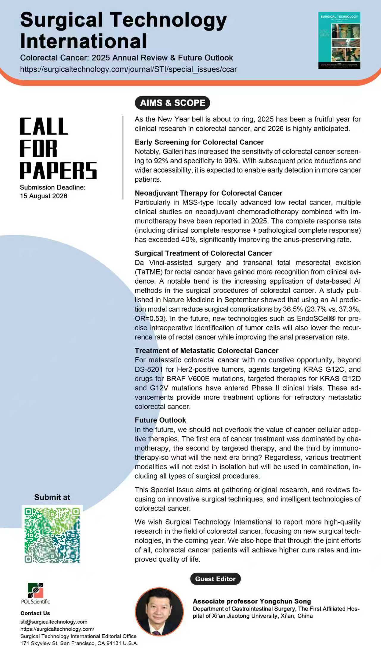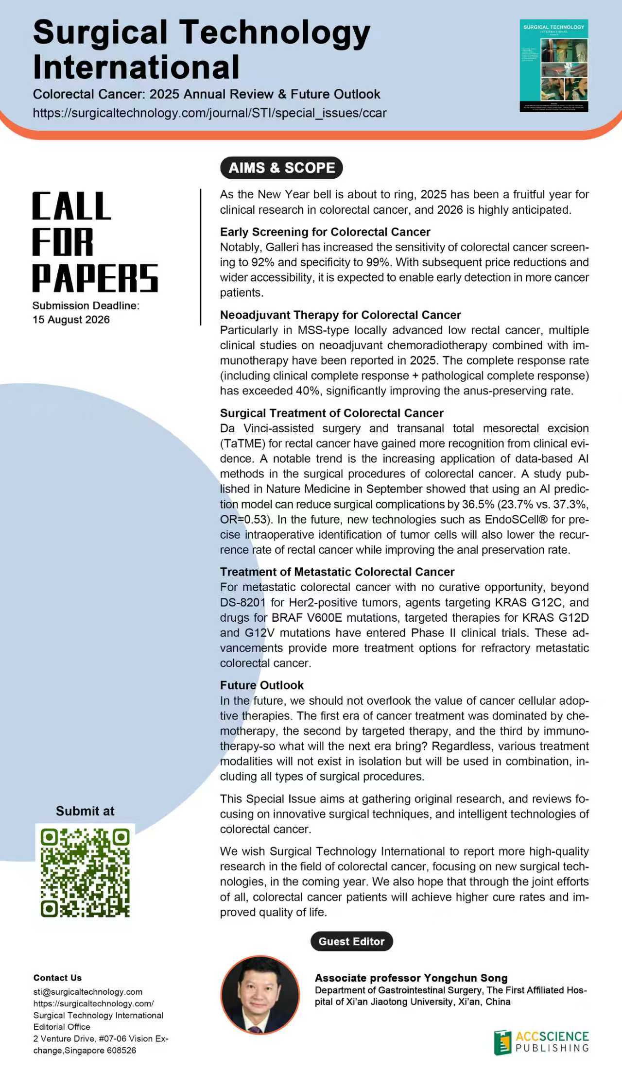 We wish Surgical Technology International to report more high-quality research in the field of colorectal cancer, focusing on new surgical technologies, in the coming year. We also hope that through the joint efforts of all, colorectal cancer patients will achieve higher cure rates and improved quality of life.