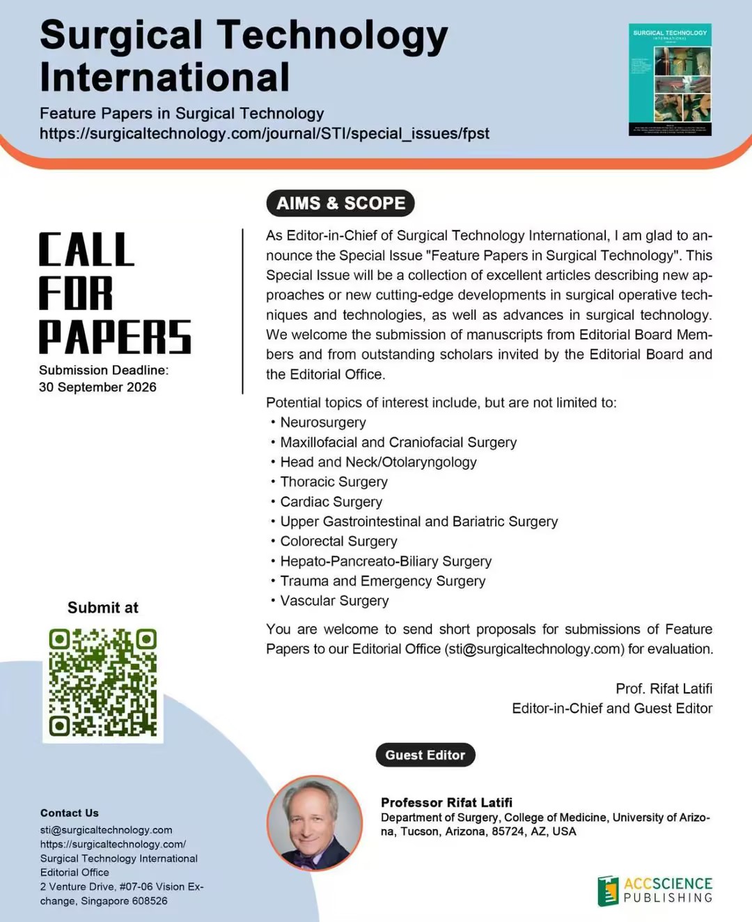You are welcome to send short proposals for submissions of Feature Papers to our Editorial Office (sti@surgicaltechnology.com) for evaluation.